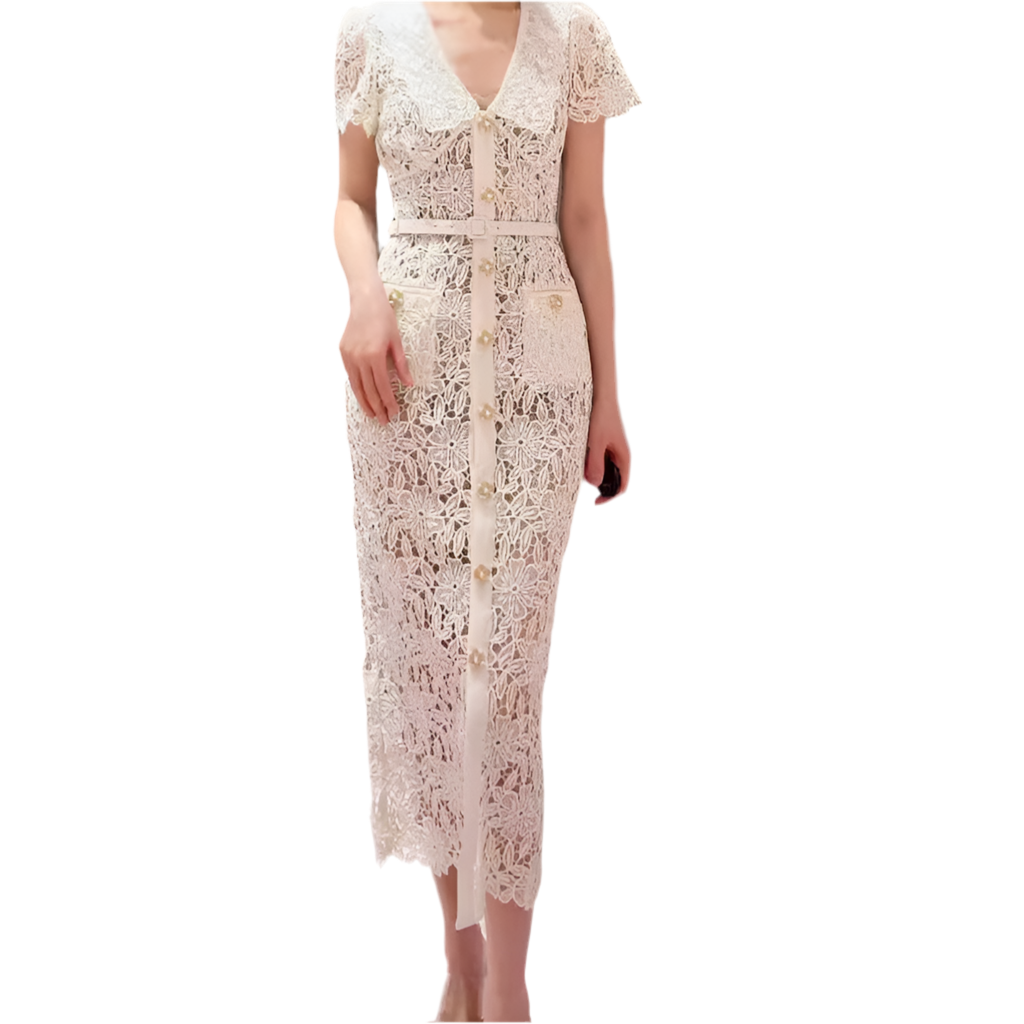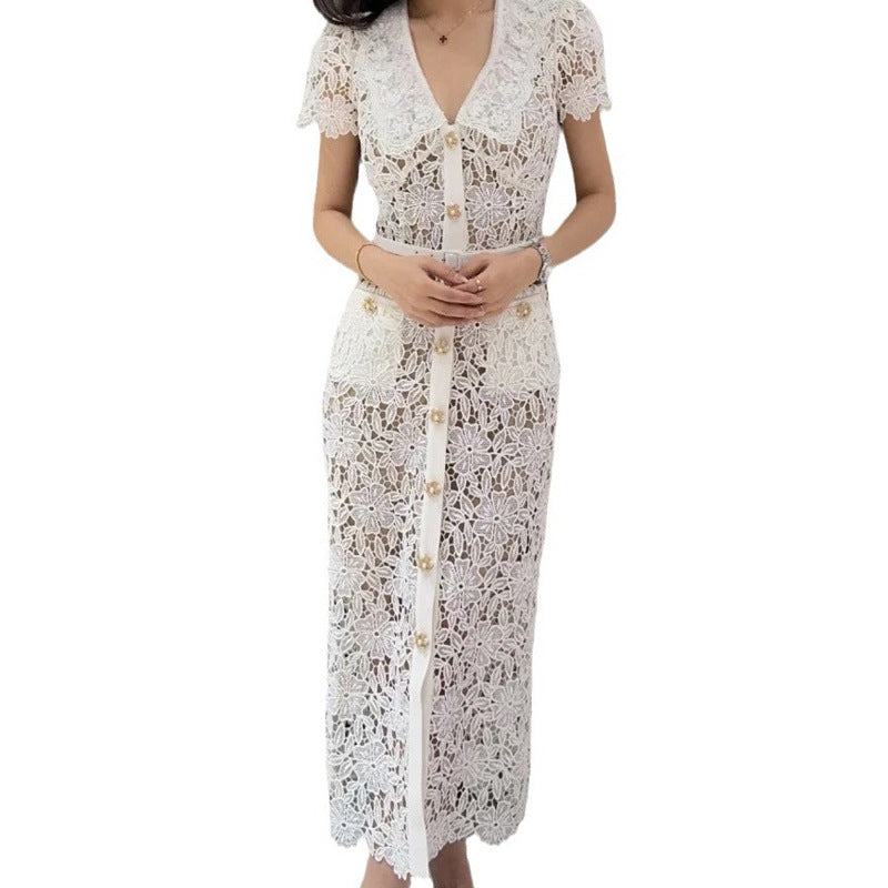 Elegant Short Sleeve Lapel Refined Handmade Lace Waist Dress