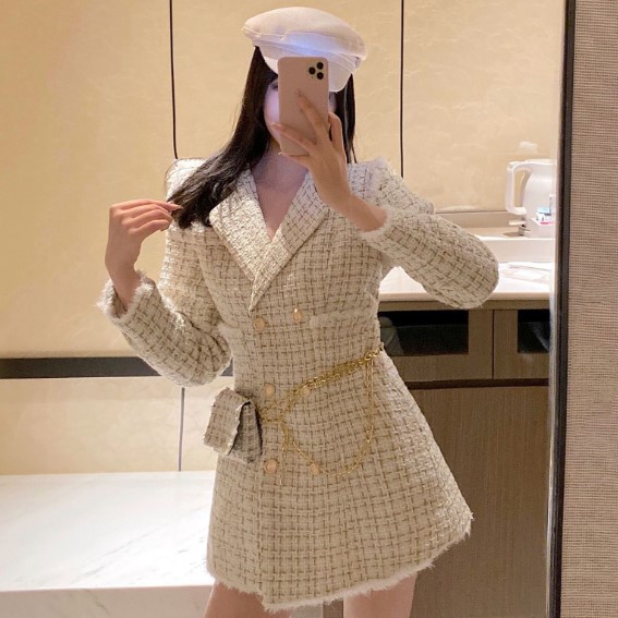 New Gold thread Plaid Suit Coat Women Notched Double breasted Feather Tassel Trim Slim Tweed Jacket With Free Belt bag