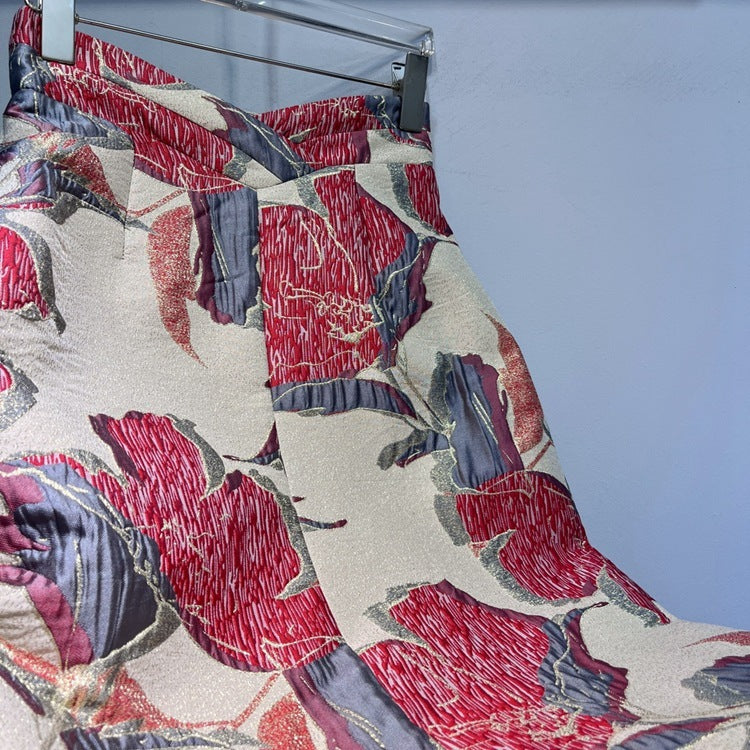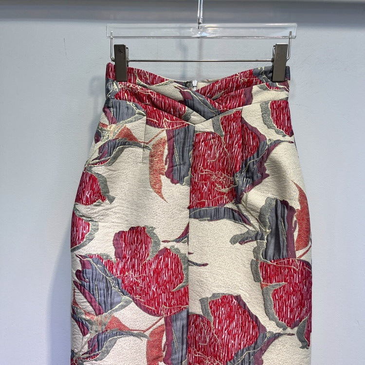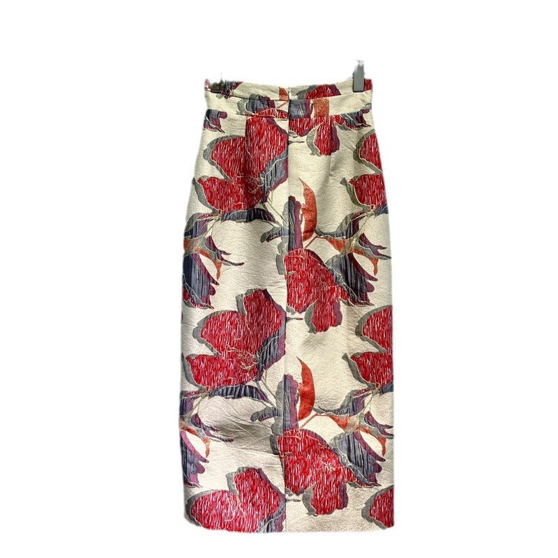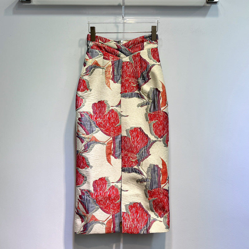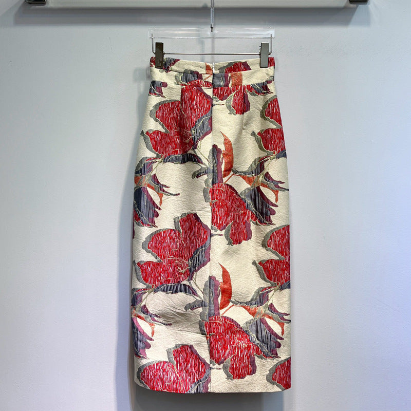 Red Printed High Waist Slit Sheath Skirt