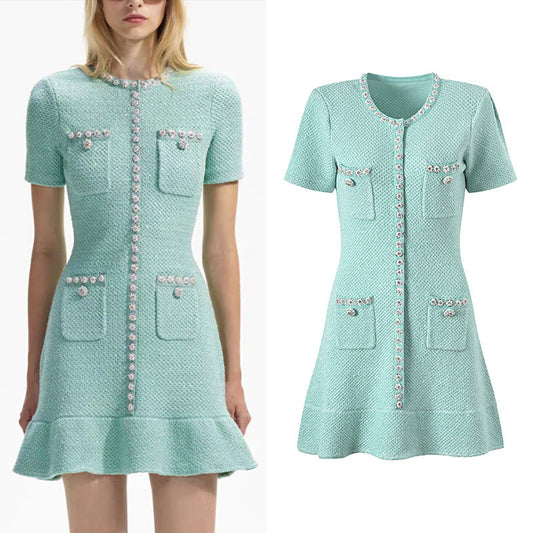 Handmade Diomand Sequins Single-breasted Ruffles Waist Trimming Knitted Dress